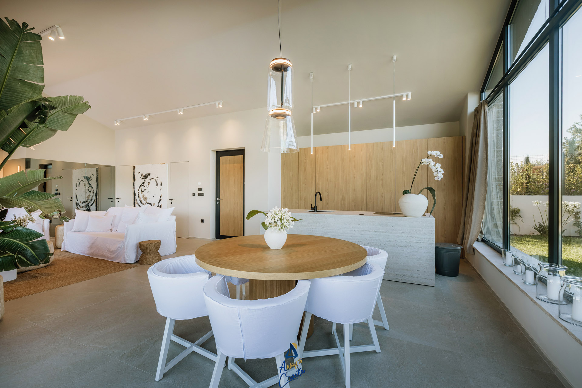 Modern Open-Plan InteriorThe villa features a contemporary open-plan layout with a fully equipped kitchen, dining area, and a bright, spacious living room. Large sliding doors open directly onto the pool terrace, blending indoor and outdoor spaces seamlessly.