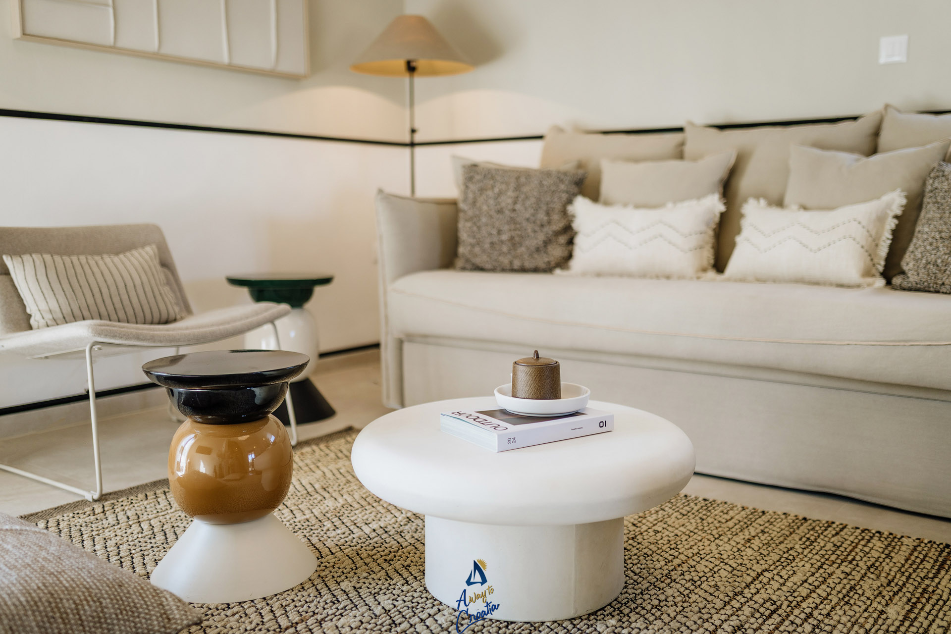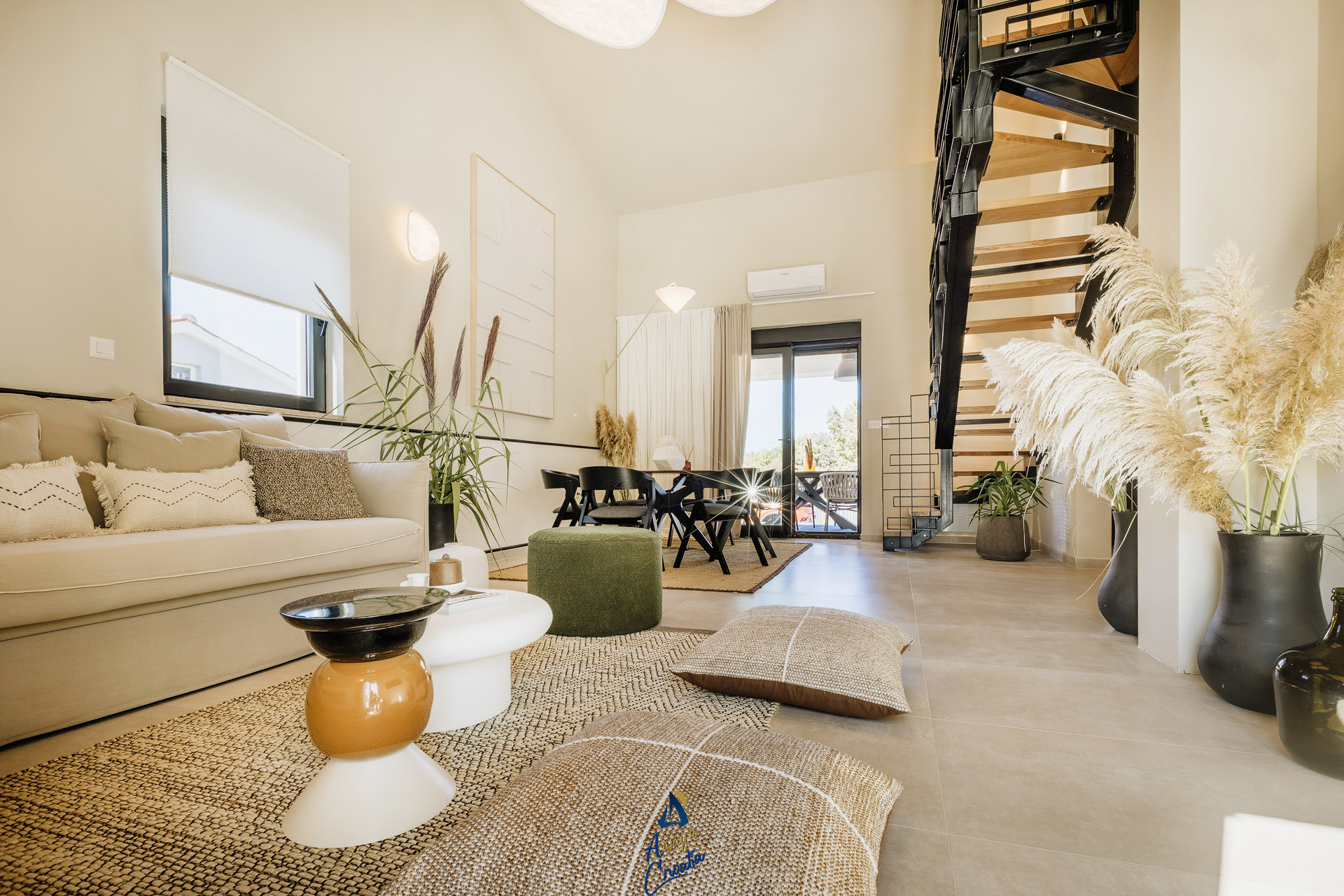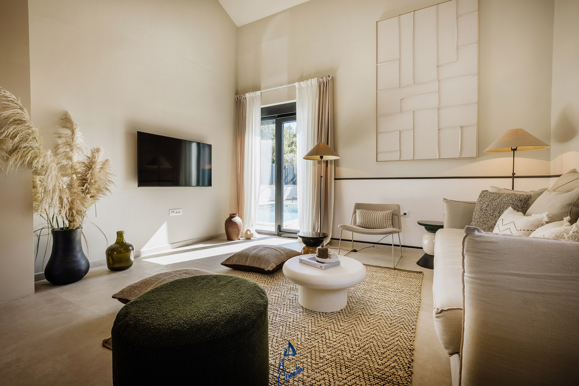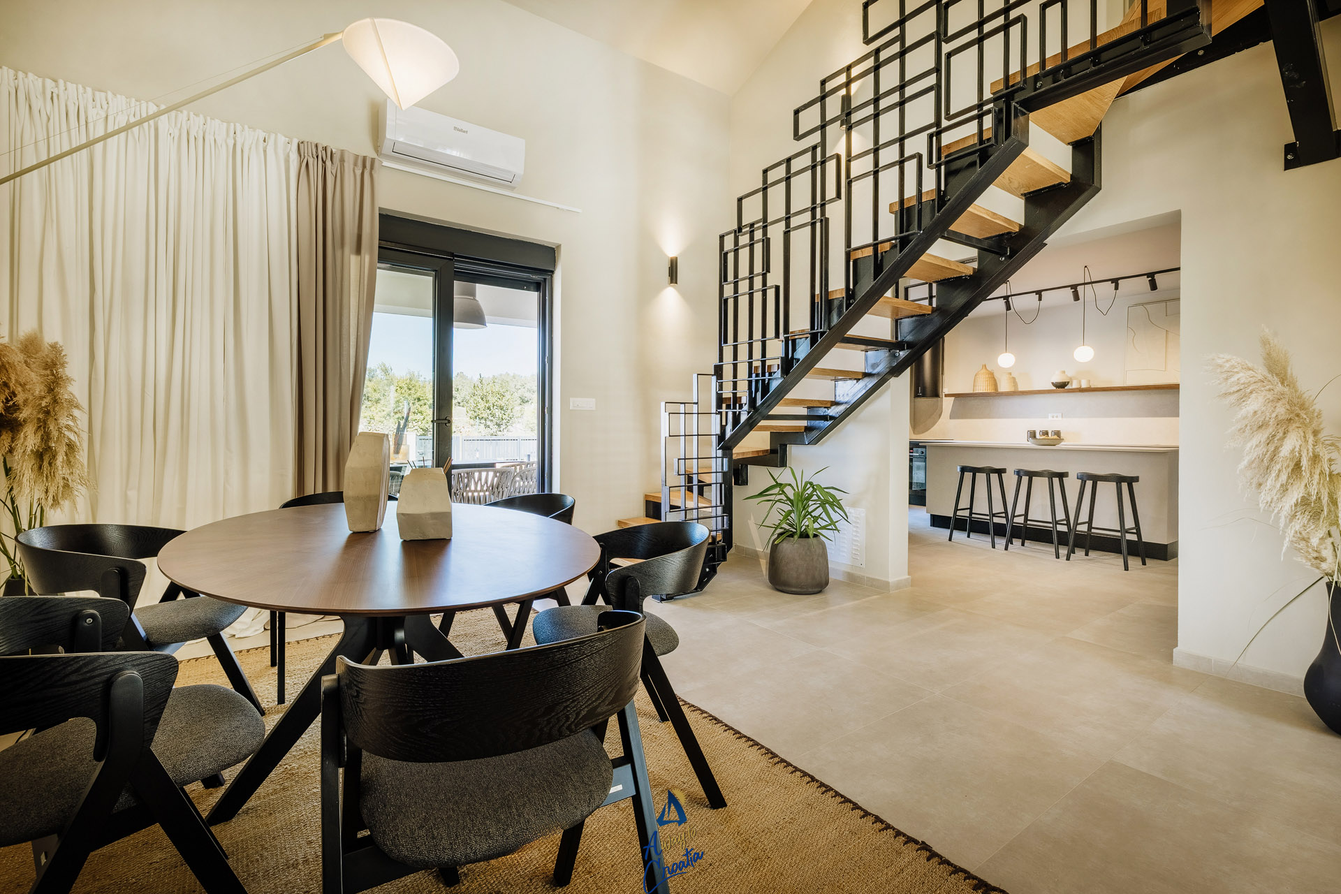 At the heart of the villa lies a bright and welcoming living room, perfect for cozy evenings, games, or simply relaxing with loved ones. The living room also features a sofa bed, where an additional 2 guests can sleep comfortably. From here, step directly out onto the sun-kissed terrace where the magic truly happens.